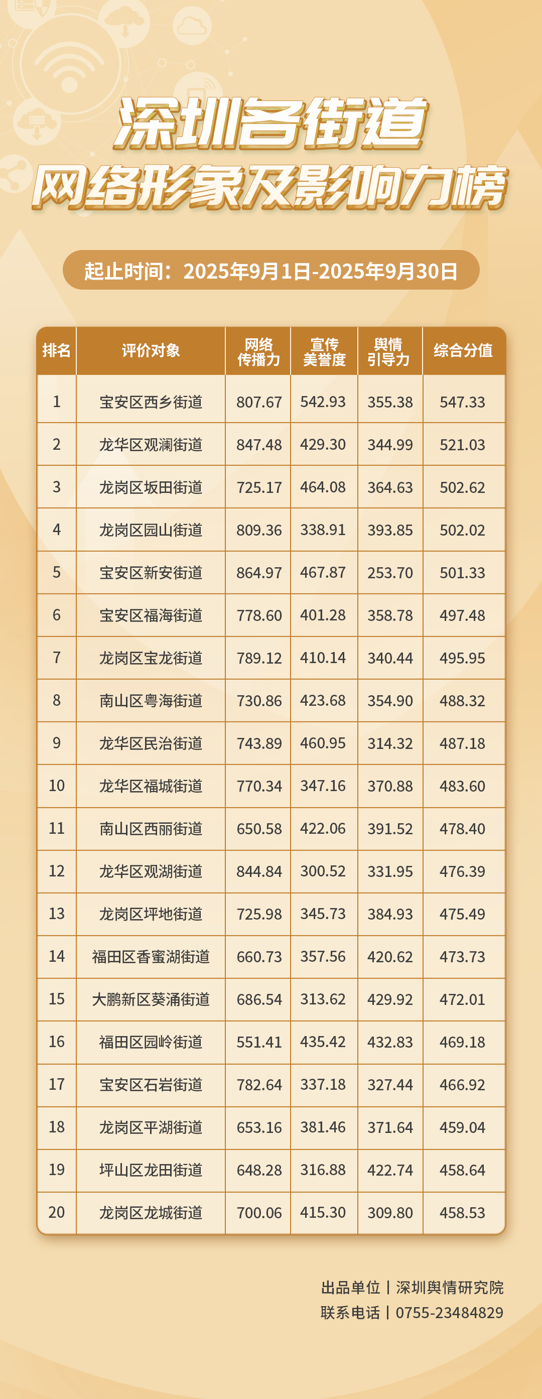 為深入了解深圳市各街道的網(wǎng)絡形象構建狀況和社會影響,推動街道治理“提質增效”,增強城市高質量發(fā)展動能,深圳輿情研究院編制推出《深圳各街道網(wǎng)絡形象及影響力榜》。榜單具有獨立客觀的評價體系,通過數(shù)據(jù)采集和分析,評估各街道的網(wǎng)絡傳播力、宣傳美譽度及輿情引導力,并對全市11個區(qū)共78個街道的網(wǎng)絡形象及影響力進行綜合排名。