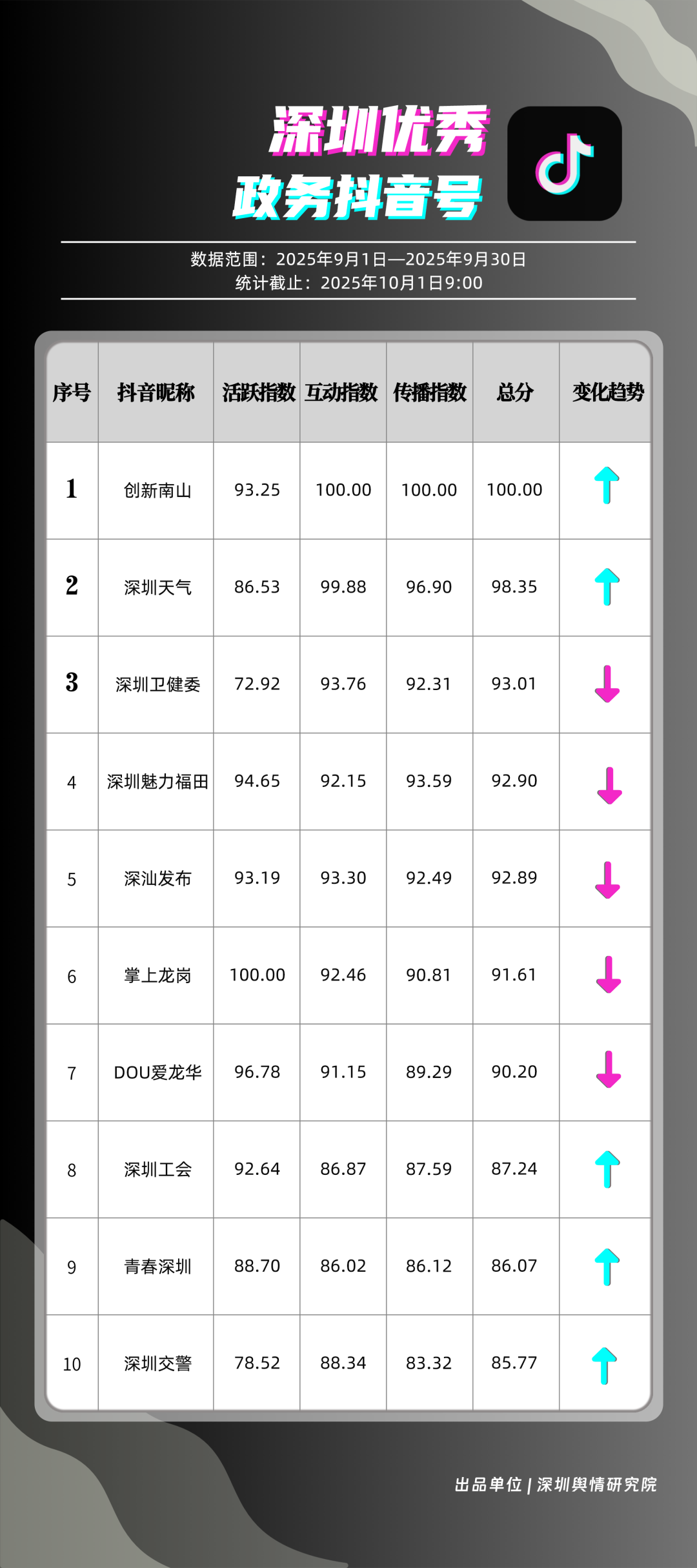 9月,獲得“優(yōu)秀政務(wù)抖音號(hào)”稱號(hào)的是“創(chuàng)新南山”“深圳天氣”“深圳衛(wèi)健委”“深圳魅力福田”“深汕發(fā)布”“掌上龍崗”“DOU愛(ài)龍華”“深圳工會(huì)”“青春深圳”“深圳交警”?!皠?chuàng)新南山”以一條有關(guān)“青春不被年齡限定”的視頻獲得超34萬(wàn)次轉(zhuǎn)發(fā),超14萬(wàn)次點(diǎn)贊,助力其在抖音榜單居于榜首;“深圳天氣”多條臺(tái)風(fēng)相關(guān)視頻吸引大量網(wǎng)民關(guān)注、互動(dòng),在抖音平臺(tái)得分超98分;“深圳衛(wèi)健委”“深圳魅力福田”“深汕發(fā)布”等賬號(hào)緊隨其后,得分均在92分以上。上榜的優(yōu)秀政務(wù)抖音號(hào)以“有溫度”的敘事表達(dá),將宣傳、服務(wù)內(nèi)容轉(zhuǎn)化為網(wǎng)民喜聞樂(lè)見(jiàn)的視頻,收獲高點(diǎn)贊、高轉(zhuǎn)發(fā)的流量實(shí)績(jī),更在評(píng)論區(qū)形成了良性互動(dòng)生態(tài),深度運(yùn)營(yíng)收獲了較好成果。