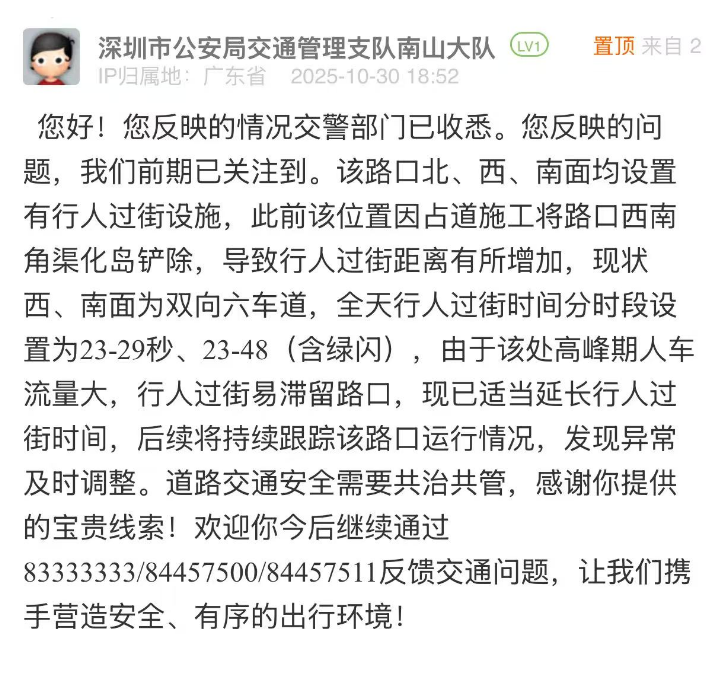 案例點評:南山交管部門在24小時內對市民所反饋的問題進行答復,展現出精準、高效的治理態(tài)度,既說明過街時間短的原因,又根據該路口在高峰期人流大的實際情況,適當延長過街時間,體現出“因需調整、務實便民”的理念?;貞校摬块T還強調后續(xù)將持續(xù)跟蹤路口通行情況、及時優(yōu)化調整等,展示了精細化治理的決心和理念。