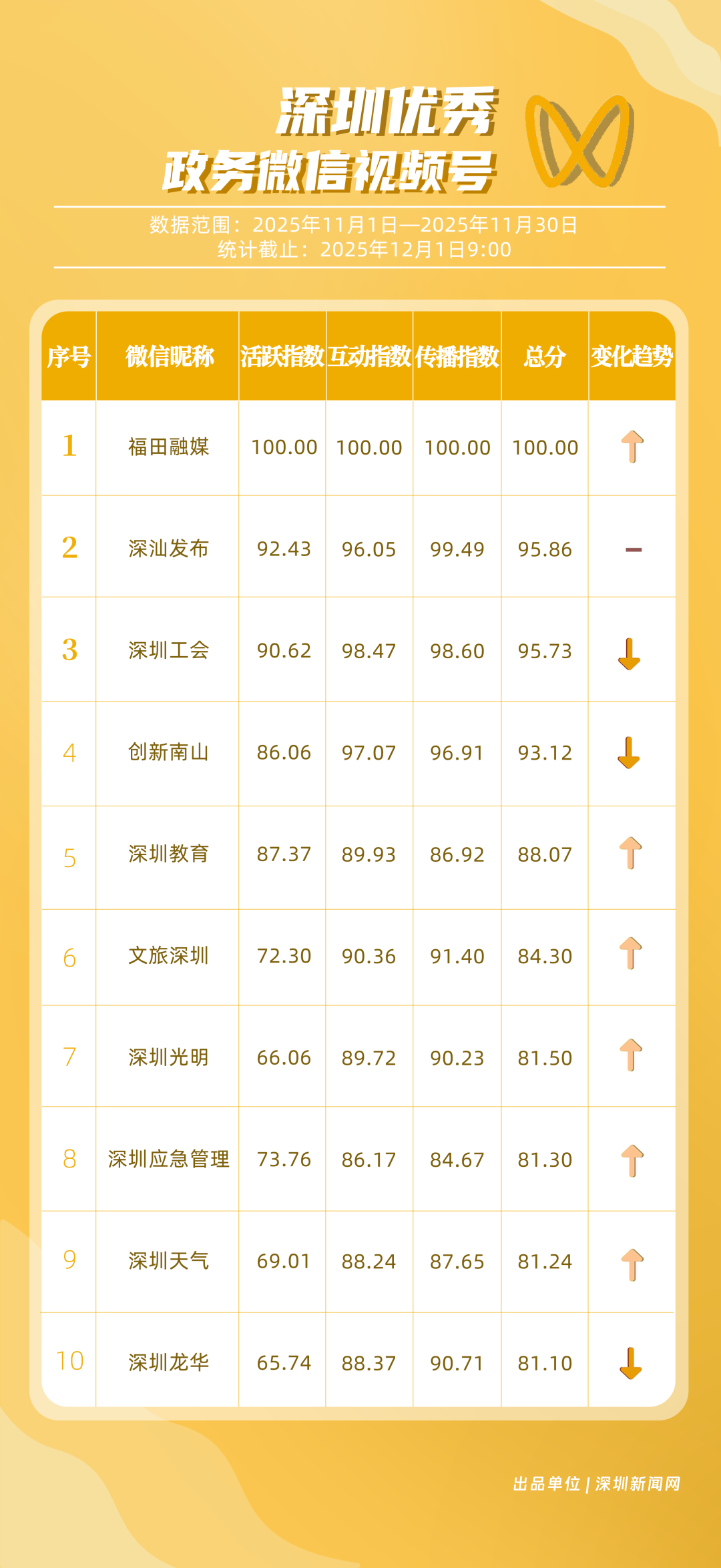 2025年11月期《深圳優(yōu)秀政務(wù)新媒體矩陣》正式發(fā)布,本期上榜矩陣持續(xù)提升傳播效能,通過各類創(chuàng)新實踐在政務(wù)傳播賽道強(qiáng)勢突圍,用“民生關(guān)切+區(qū)域特色”的內(nèi)容創(chuàng)作,攜手構(gòu)建起深圳政務(wù)傳播的新圖景,為政務(wù)新媒體的高質(zhì)量發(fā)展增添新能量。