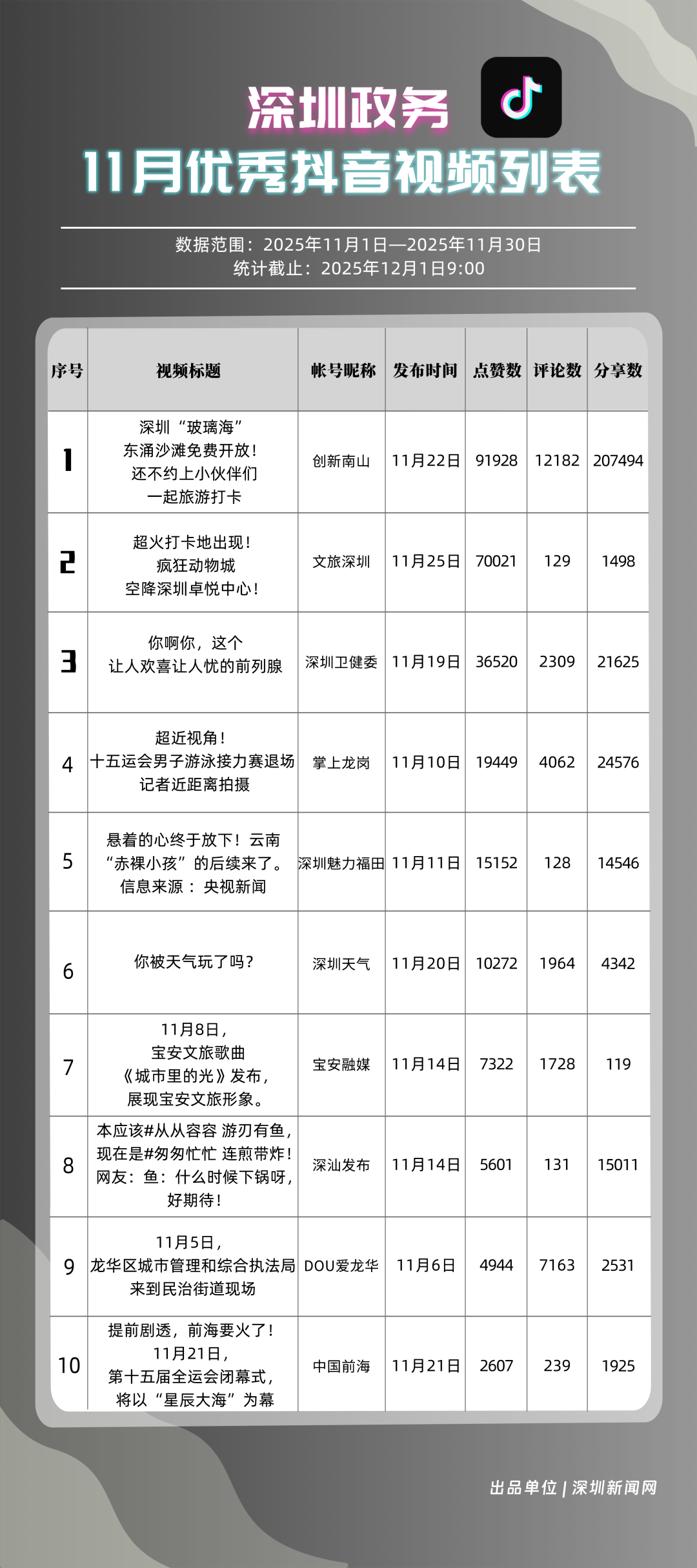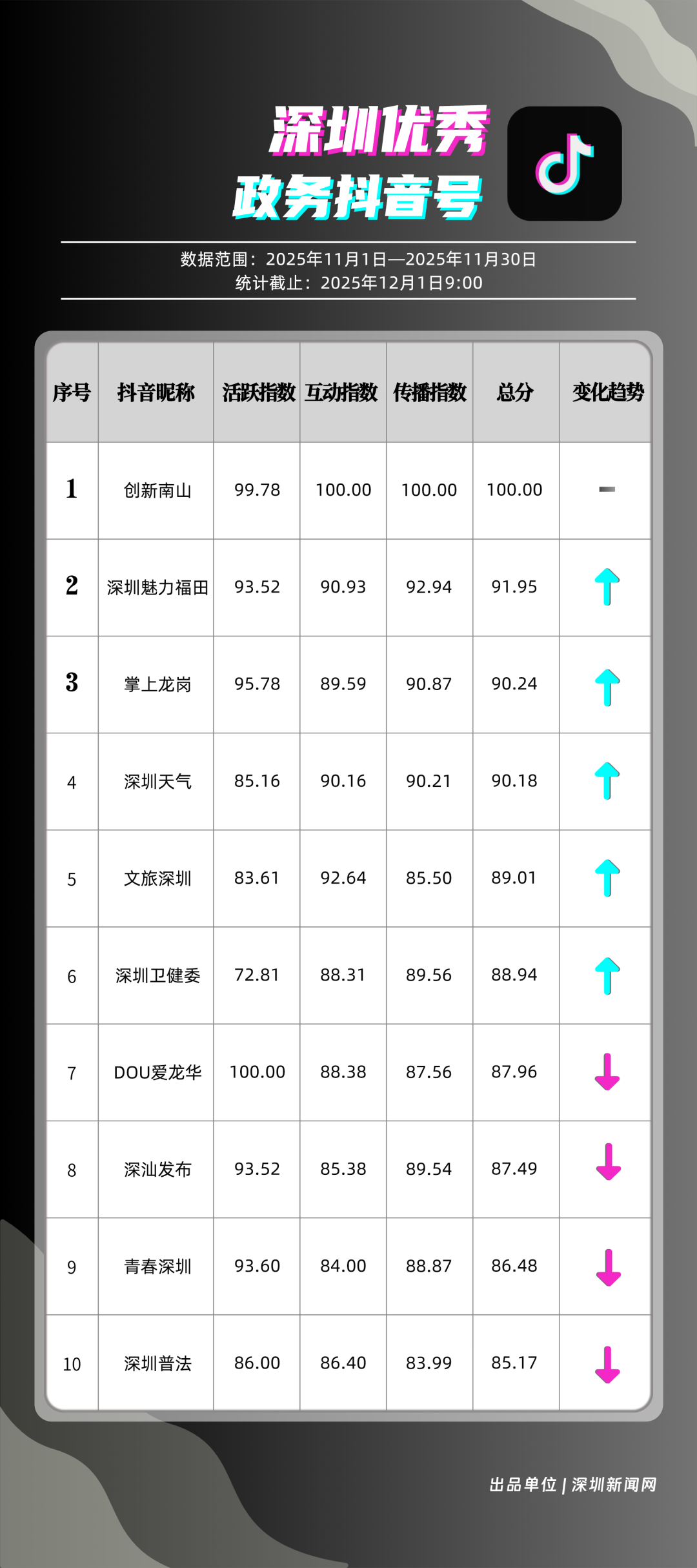 11月,獲得“優(yōu)秀政務(wù)抖音號”稱號的是“創(chuàng)新南山”“深圳魅力福田”“掌上龍崗”“深圳天氣”“文旅深圳”“深圳衛(wèi)健委”“DOU愛龍華”“深汕發(fā)布”“青春深圳”“深圳普法”。“創(chuàng)新南山”多篇文旅、健康及出行相關(guān)內(nèi)容分享超10萬次,在互動、傳播方面表現(xiàn)亮眼,蟬聯(lián)榜首;“深圳魅力福田”在各方面指數(shù)評分較為均衡,位列第二名;“掌上龍崗”在活躍指數(shù)得分較高,能夠較好均衡內(nèi)容數(shù)量與質(zhì)量,位居第三,排名較上期有所提高?!吧钲谔鞖狻薄拔穆蒙钲凇钡荣~號緊隨其后,得分均在90分上下。上榜優(yōu)秀政務(wù)抖音號通過深耕內(nèi)容創(chuàng)作,收獲了高點贊、高分享的傳播效果,也推動評論區(qū)形成正向互動生態(tài),最終以優(yōu)質(zhì)內(nèi)容為核心載體,增強(qiáng)政務(wù)賬號影響力。