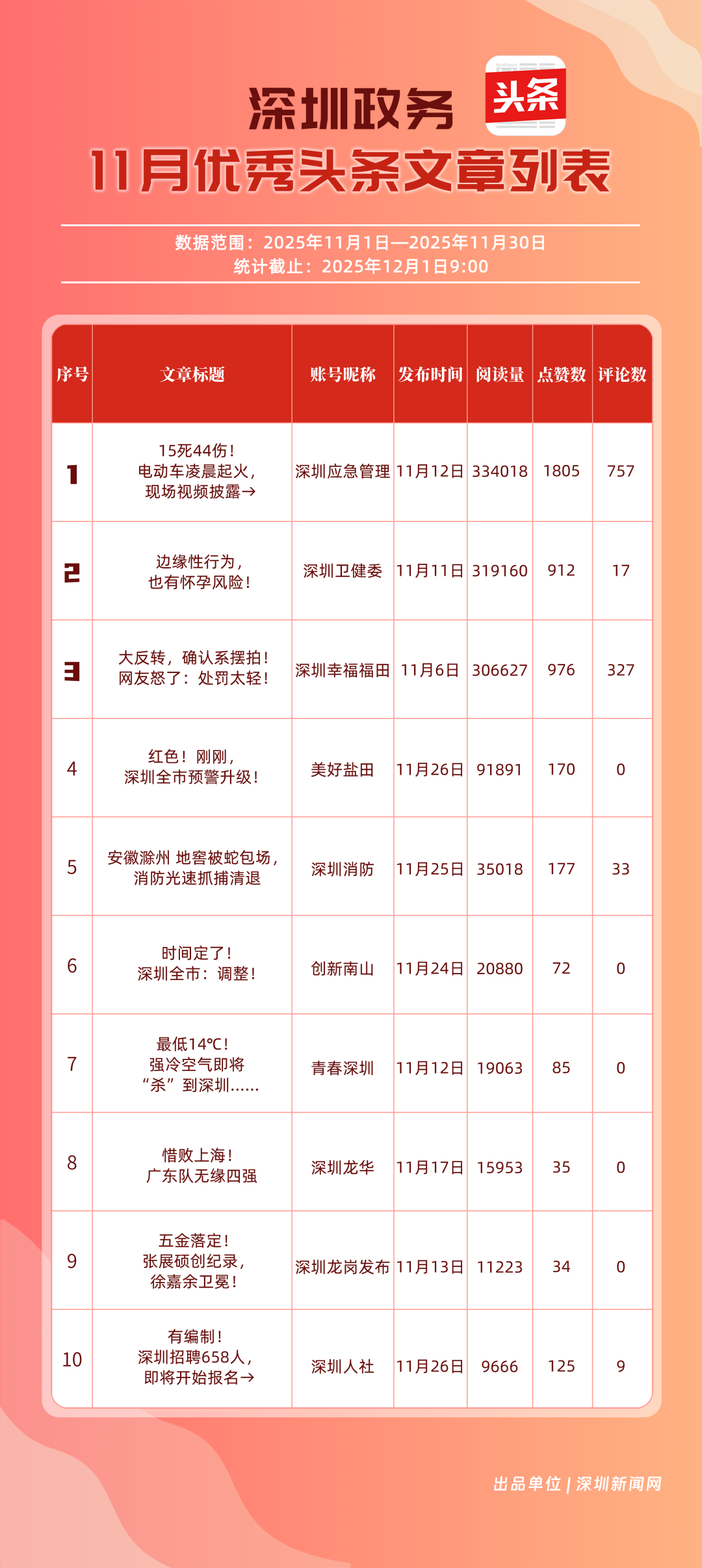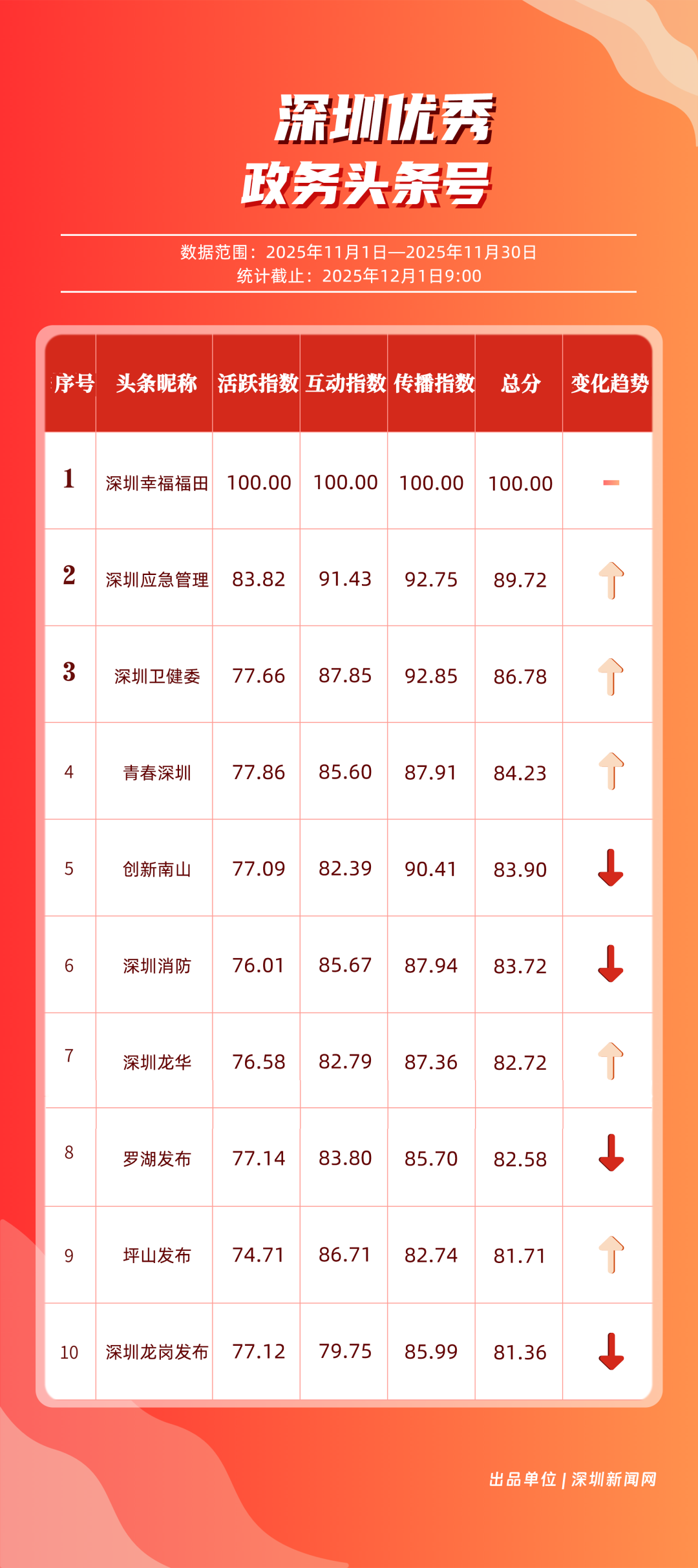 11月,“深圳幸福福田”“深圳應(yīng)急管理”“深圳衛(wèi)健委”“青春深圳”“創(chuàng)新南山”“深圳消防”“深圳龍華”“羅湖發(fā)布”“坪山發(fā)布”“深圳龍崗發(fā)布”共10個政務(wù)頭條號入選“優(yōu)秀政務(wù)頭條號”榜單。“深圳幸福福田”發(fā)揮穩(wěn)定,以滿分成績蟬聯(lián)榜首,彰顯出強(qiáng)大的政務(wù)傳播力與影響力;“深圳應(yīng)急管理”積極發(fā)布應(yīng)急、安全類內(nèi)容,位居第二;“深圳衛(wèi)健委”則以優(yōu)質(zhì)健康類信息吸引市民關(guān)注,排名上升至第3位?!扒啻荷钲凇薄皠?chuàng)新南山”“深圳消防”得分在83分以上。相關(guān)上榜賬號以內(nèi)容創(chuàng)新為紐帶,聚焦民生,為城市治理現(xiàn)代化與民生服務(wù)精細(xì)化注入了鮮活力量。