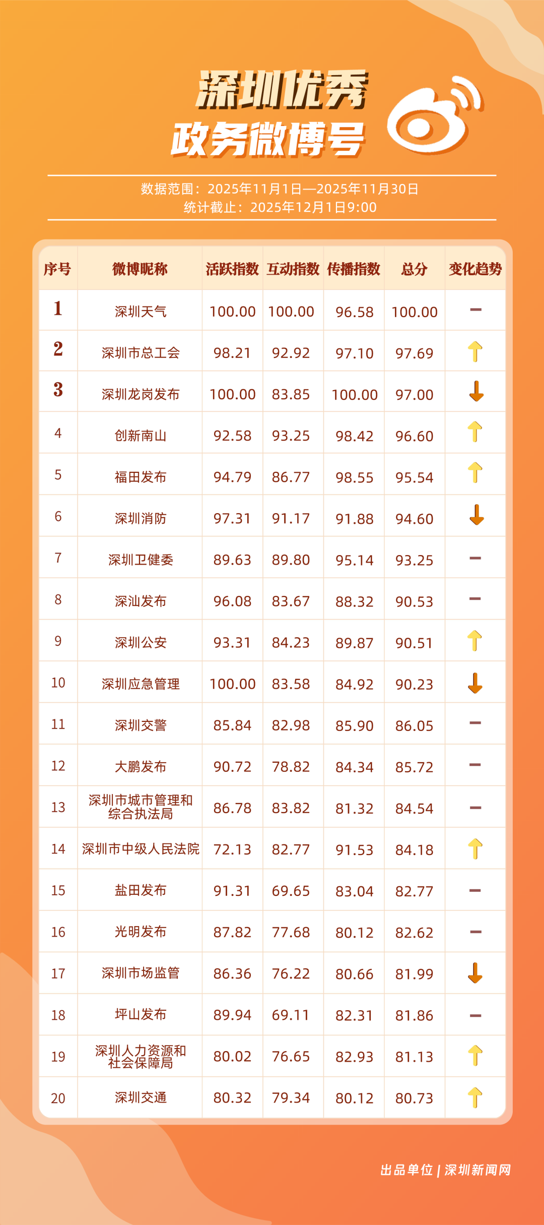 11月,20個賬號入選“優(yōu)秀政務(wù)微博號”榜單,其中包括:“深圳天氣”“深圳市總工會”“深圳龍崗發(fā)布”“創(chuàng)新南山”“福田發(fā)布”“深圳消防”“深圳衛(wèi)健委”“深汕發(fā)布”“深圳公安”“深圳應(yīng)急管理”等。其中,“深圳天氣”高頻次發(fā)布天氣類信息,受到網(wǎng)民肯定,蟬聯(lián)榜首;“深圳市總工會”發(fā)布互動抽獎、十五運等多元內(nèi)容,排名提升至第二;“深圳龍崗發(fā)布”在傳播指數(shù)獲得較高得分,助力其位列第三。上榜優(yōu)秀政務(wù)微博賬號以優(yōu)秀內(nèi)容提升賬號競爭力,贏得公眾認(rèn)可,實現(xiàn)了政務(wù)信息的有效傳播,為政務(wù)新媒體的內(nèi)容運營與價值傳遞提供參考。