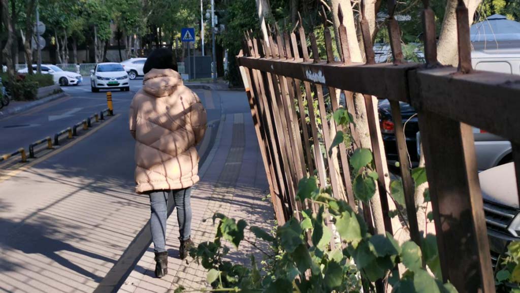 由于竹香一路一側(cè)人行道通行距離不足一米,且靠近深南汽配城的鐵柵欄”張牙舞爪“,搖搖欲墜,向外傾斜擠壓了通行空間,不少家長讓孩子走在人行道上,自己則是走在車行道上,與身邊的汽車擦肩而過。